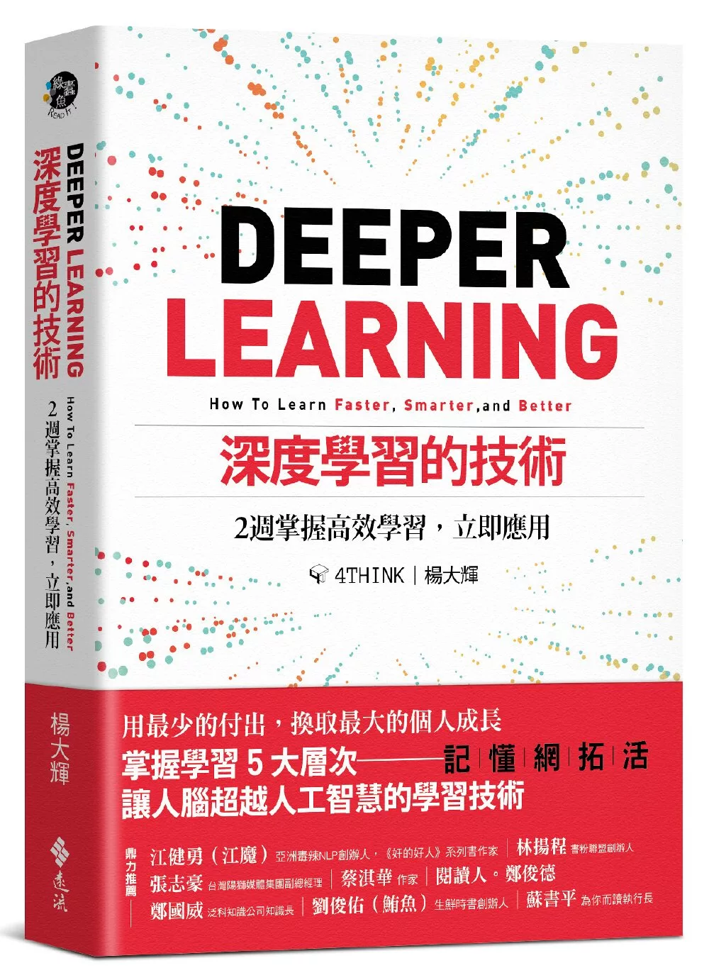 我常在楊大輝的4THINK上看到許多跨領域、顛覆性的深度好文,翻閱本書才發現,原來秘訣就在「記、懂、網、拓、活。」學如逆水行舟,不用則退,讀完書後也別忘運用,畢竟學習只是過程,你想完成的目標,才是終點。──劉俊佑(鮪魚)/生鮮時書創辦人