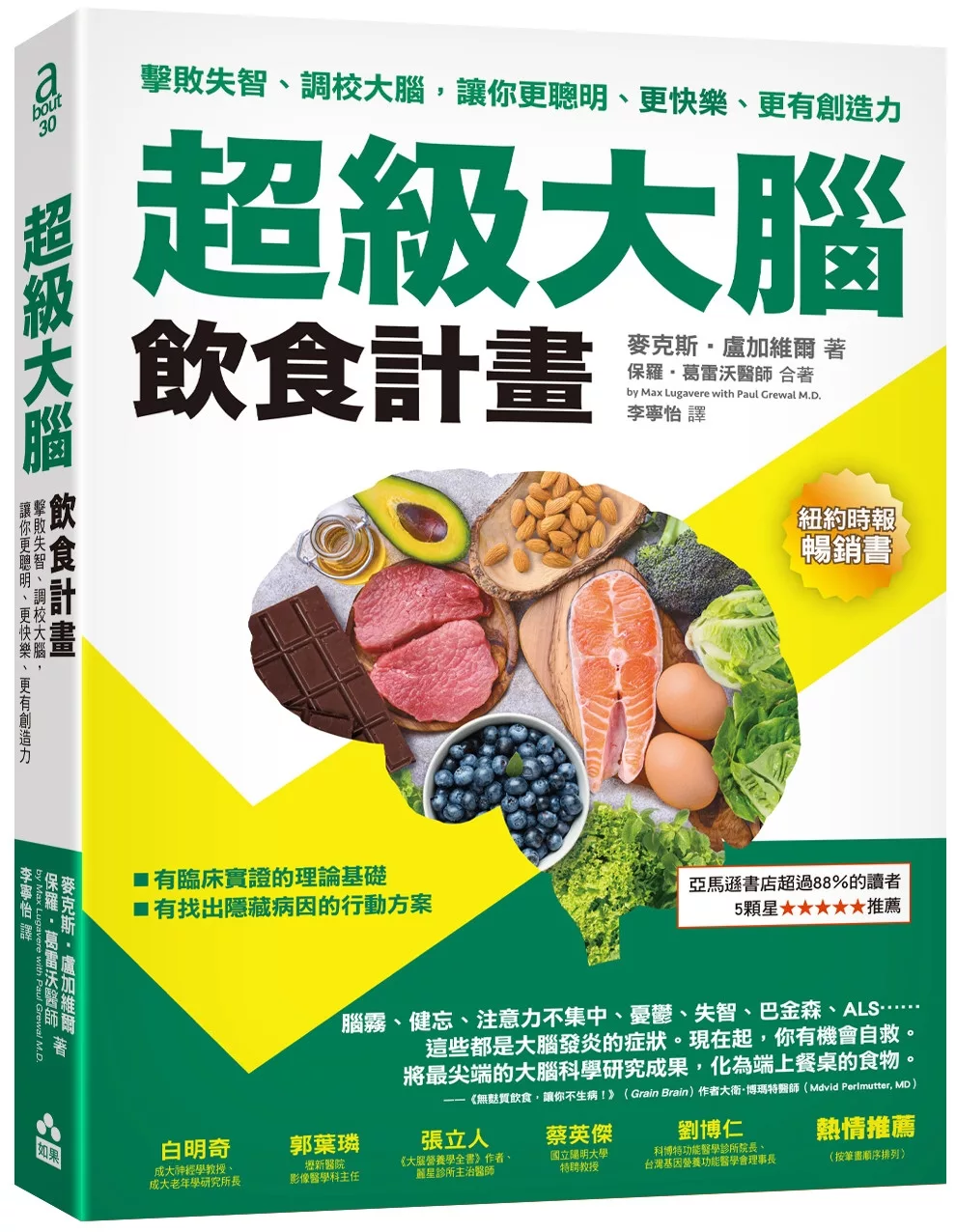 •「麥克斯・盧加維爾追求的是對他個人極具意義的任務:鑽研愈來愈受關注的失智症與認知衰退等議題,並將成果傳達給大眾。在《超級大腦飲食計畫》一書中,他用我見過最精彩的方式簡要匯整了有關大腦健康的營養科學知識。這本書真摯易讀又符合實際需求,破解了傳統的飲食建議傳達的錯誤訊息,結論出人意料又鏗鏘有力。如果你想了解如何預防認知衰退和失智,這本書絕對是必讀之作。」——《小麥完全真相》(Wheat Belly)系列、《Undoctored》一書作者威廉・戴維斯(William Davis)
