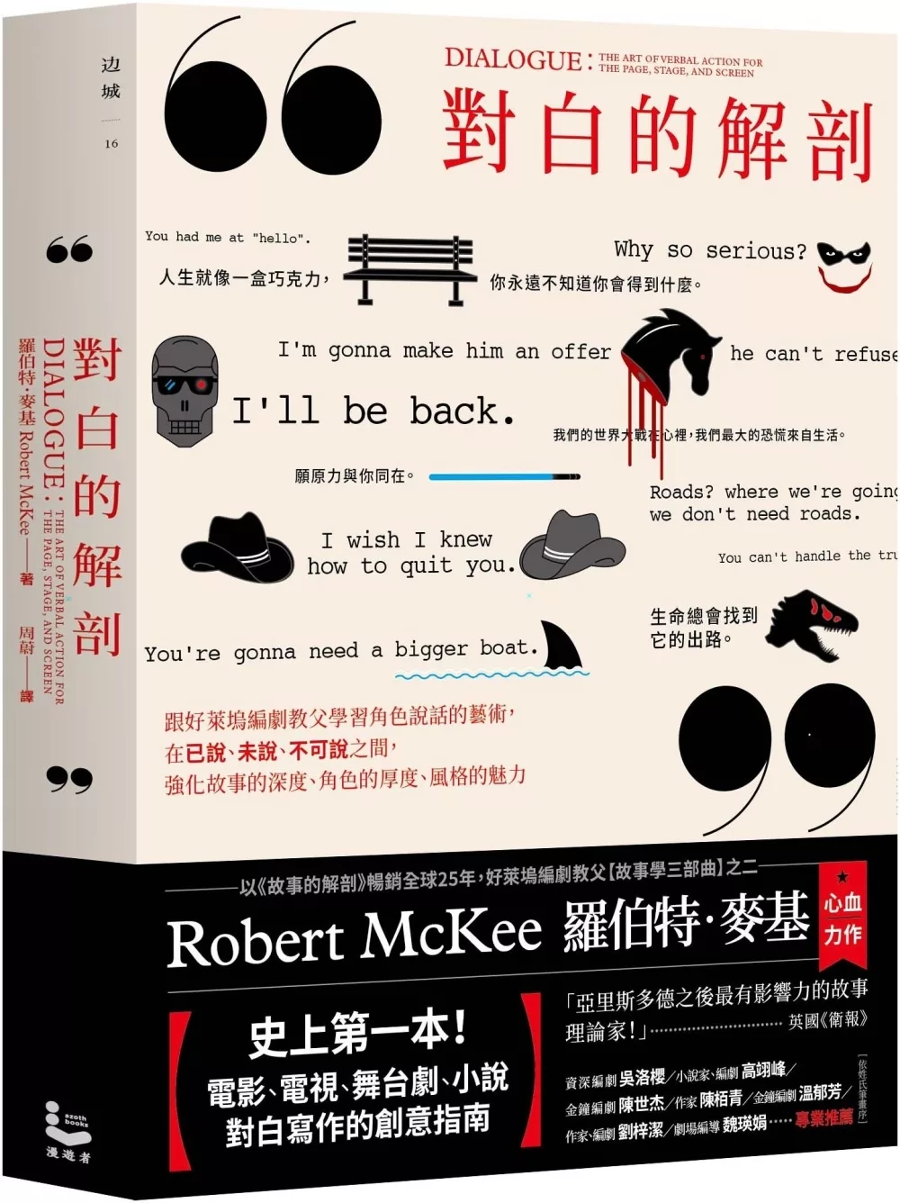 史上第一本對白寫作教學書。麥基徹底剖析了對白的可見與不可見結構。他掌握了一門通常被視為只能憑據本能、有如魔法一般的技藝,並揭露它在人心造就化學反應的祕密。——Terry Johnson/編劇暨導演,奧利佛獎(Olivier Award)、劇評人獎(Critics' Circle Theater Award)、美國編劇工會獎、英國影藝學院電影獎得主