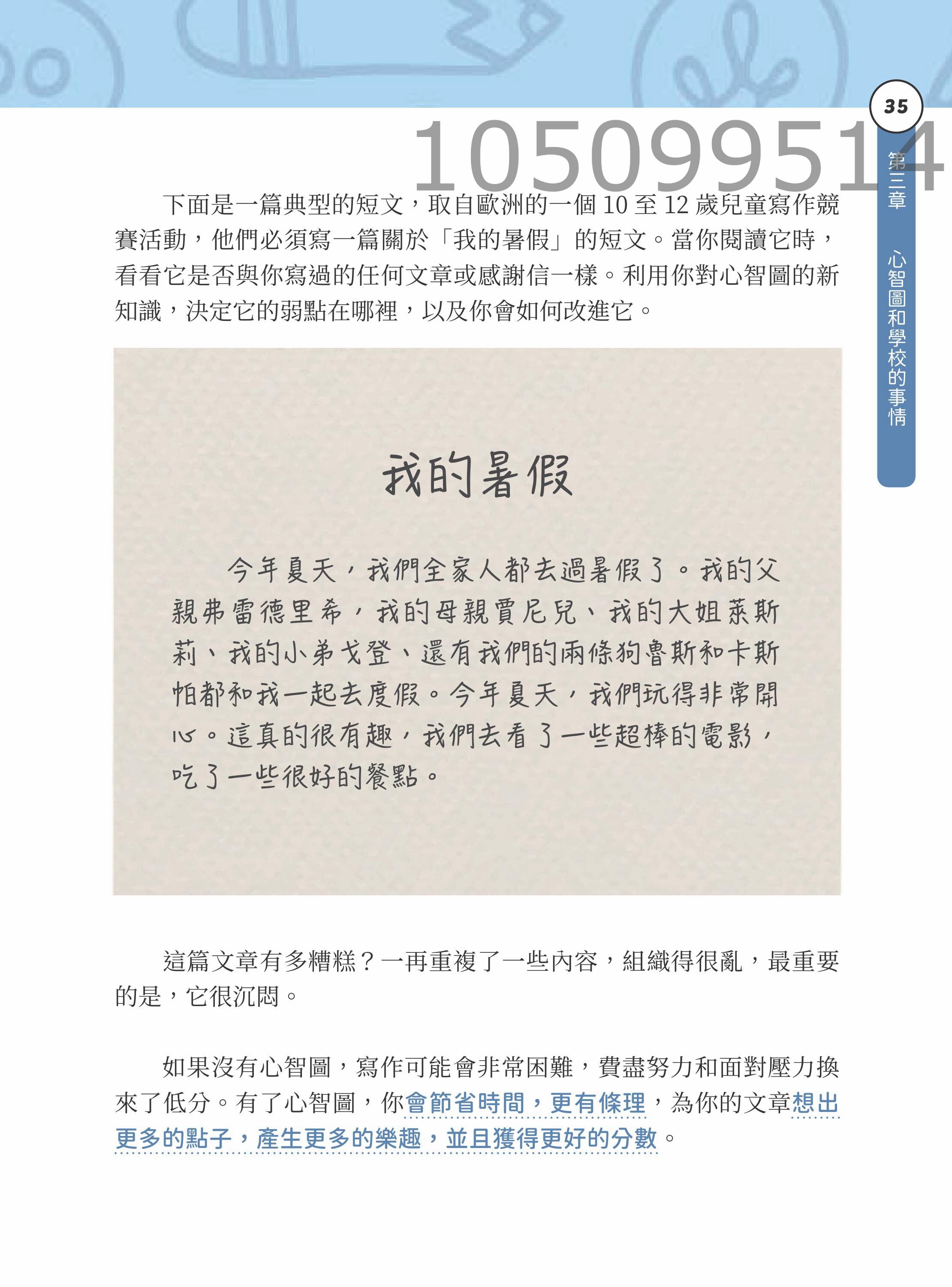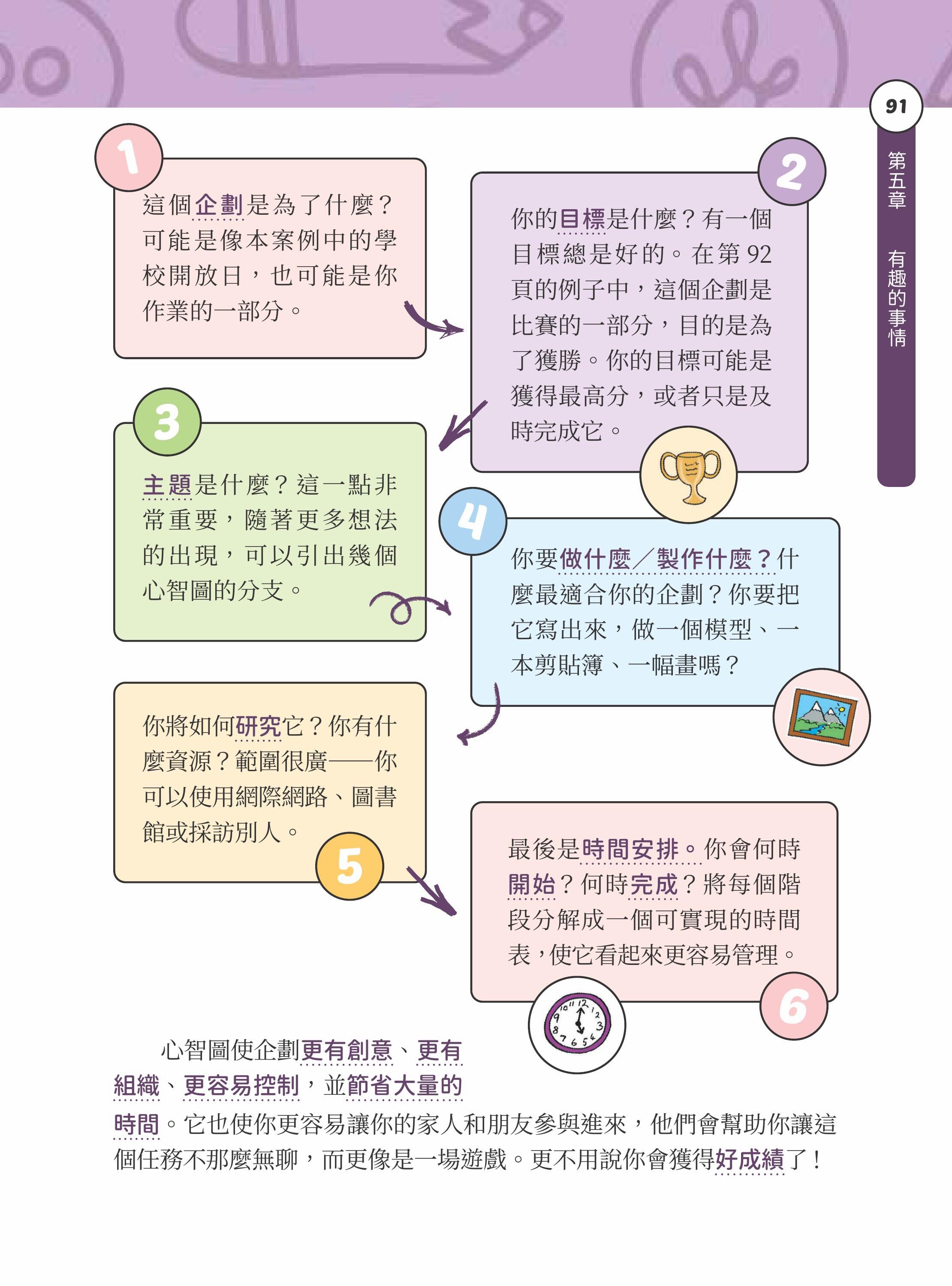 除了應對考試、做筆記之外,這本書還有提供實用的專案規畫,從生活中可以取材心智圖繪製案例,像是整理房間、策畫派對、旅遊清單。它不僅僅是一本工具書,更是個能夠啟發學生思維的寶庫。透過使用心智圖法,孩子能夠更清晰地整理自己的思緒,激發創意,並在學習過程中取得更好的成績!