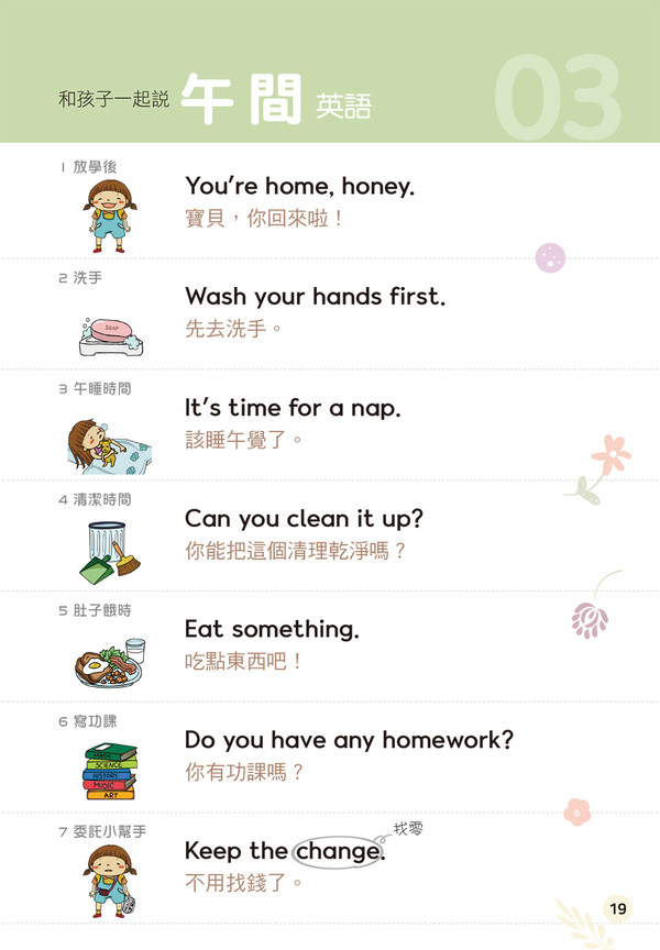 每天最常對孩子說的話,通通有超簡單好用的句型來替換,讓爸媽運用自如,英語能說一整天。